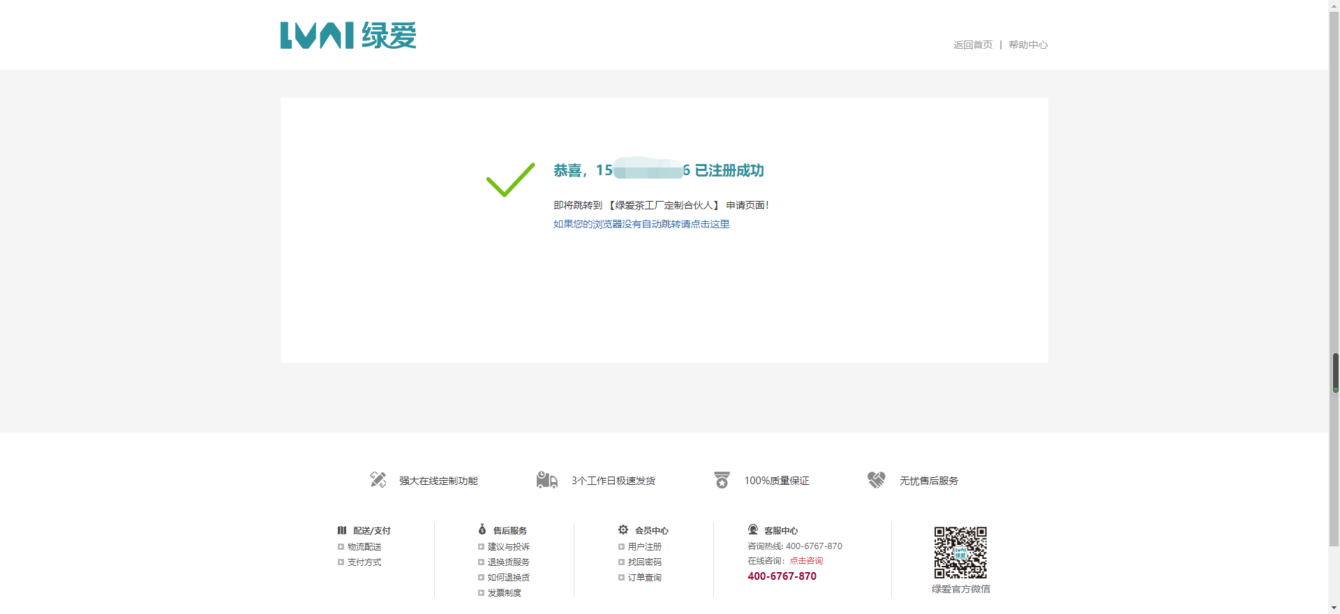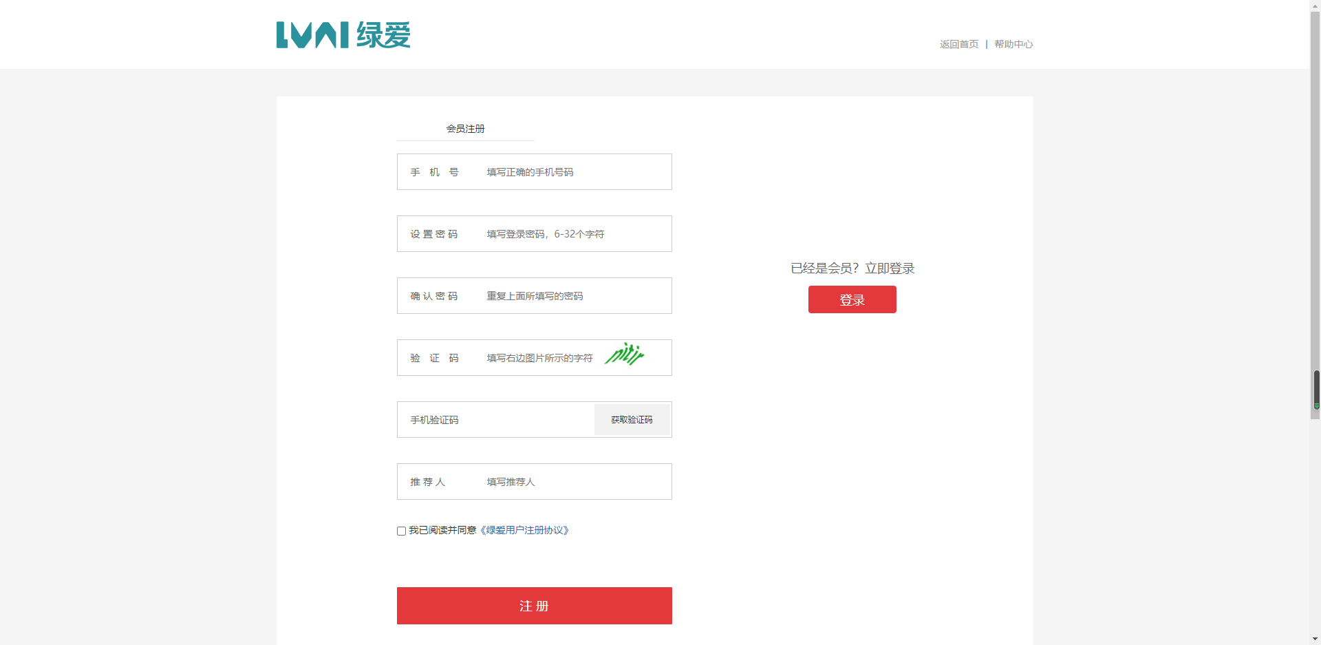 1、打开绿爱网站首页,点击右上角“注册”,进入注册页面,如下图所示 2、在注册页面依次输入手机号、密码、确认密码、验证码、手机验证码、推荐人、勾选“我已阅读并同意《绿爱用户注册协议》”,如下图所示: 其中手机验证码需要点击获取验证码按钮来获取;推荐人需要填写真实有效的推荐人姓名,如果没有推荐人姓名,请联系与您对接的销售。 全部信息填写无误后,请点击记最下方的红色“注册”按钮。 3、如出现以下界面,则说明注册成功。